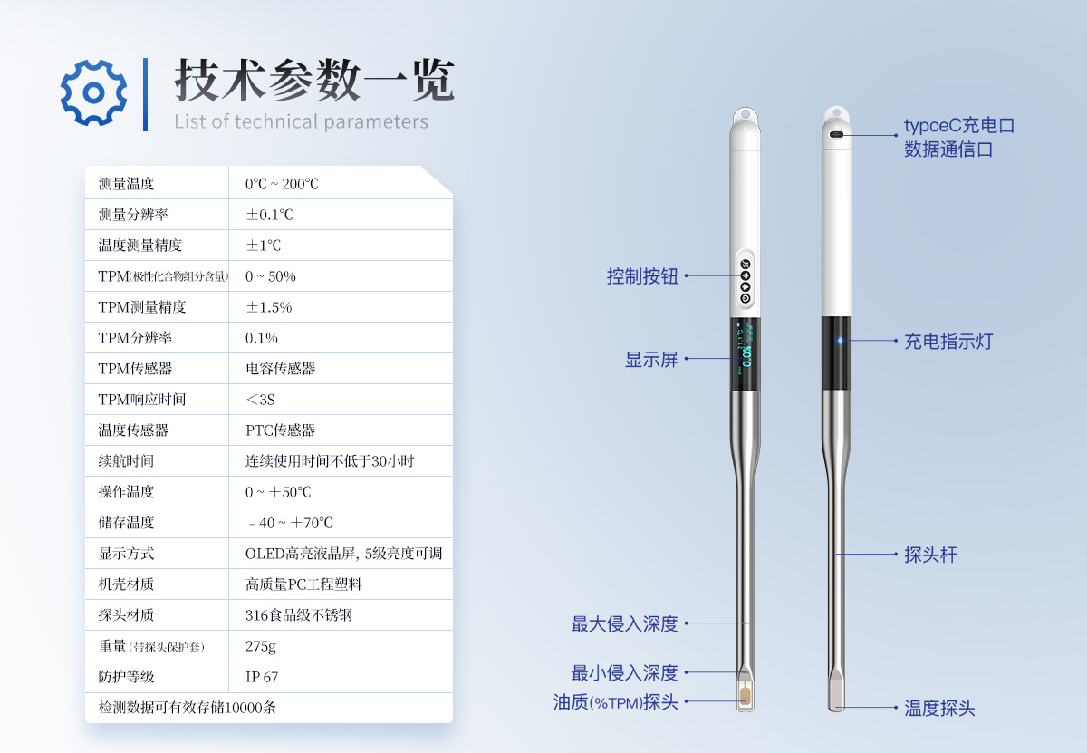 食用油脂是人們攝取能量和營養(yǎng)的重要來源,是加工食品的重要原料。油炸食品以其特有風(fēng)味廣受消費(fèi)者喜歡。用于煎炸的食用油在高溫煎炸過程中發(fā)生一系列的物理、化學(xué)變化,這些變化會(huì)生成對身體健康有害的物質(zhì)。目前,煎炸食用油的傳統(tǒng)檢測方法多為化學(xué)方法,這些方法必須在實(shí)驗(yàn)室內(nèi)由專業(yè)人員操作,費(fèi)時(shí)費(fèi)力,化學(xué)試劑的使用可能會(huì)傷害檢測人員健康,且化學(xué)廢劑污染了環(huán)境。YT-SYP是一種快速,安全,**食用油品質(zhì)檢測儀,能夠快速檢測食用油中的極性化合物組分含量。本產(chǎn)品能夠在油溫較高的環(huán)境下使用,適用于各種煎炸的食用油品質(zhì)檢驗(yàn)。