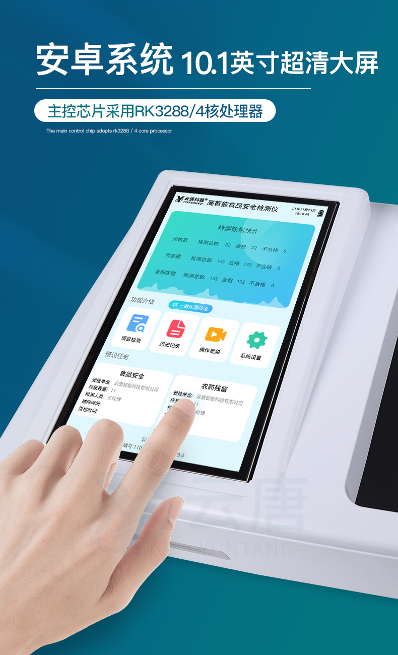 山東云唐智能科技有限公司生產的高智能食品安全檢測儀為集成化食品安全快速檢測分析設備,采用臺式一體化設計,可快速檢測200多種食品安全項目,包含非食用化學物質、濫用食品添加劑、農藥殘留、獸藥殘留、重金屬、病害肉、營養強化劑、抗生素類殘留、激素類殘留、真菌毒素類殘留、化學類殘留等項目的定性定量檢測。