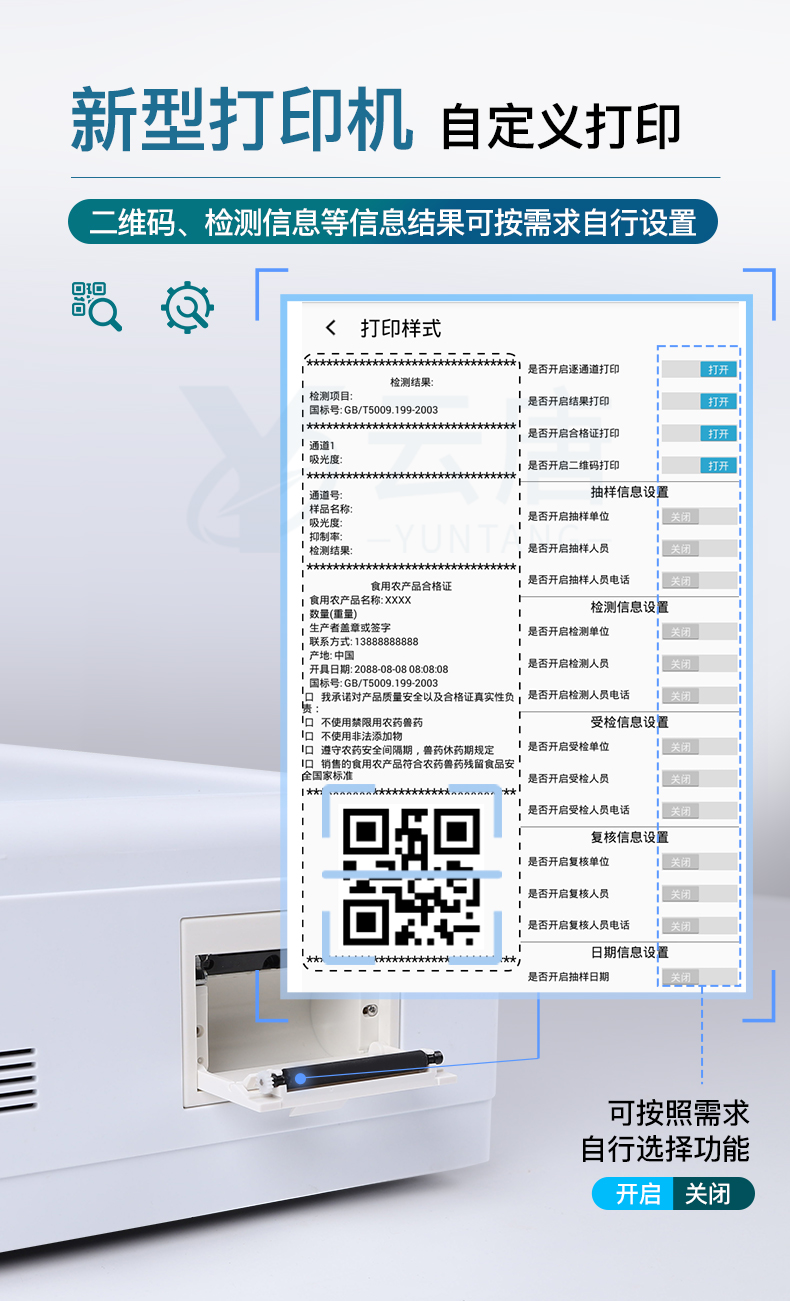 ★自定義打印系統:內置熱敏打印機;系統打印格式多樣化,產品合格證(國家農業部標準要求),二維碼,抽樣信息、檢測信息,受檢信息、復核信息、抽樣日期、檢測日期等信息結果,可按實際需求自行設置開啟或關閉,完成打印。(需提供對應證明)