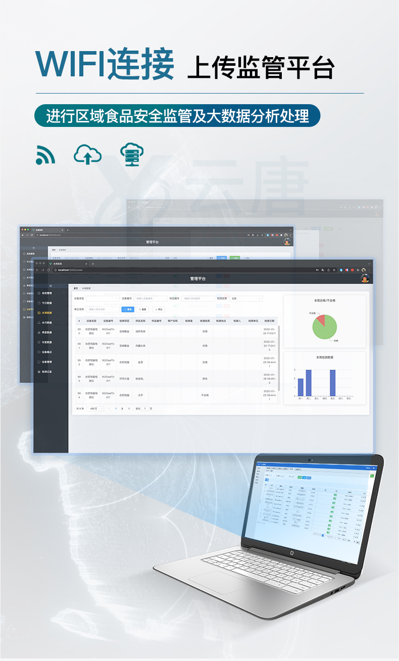 ★數據監管系統:同步對接監管平臺,數據可局域網和互聯網數據上傳,檢測結果可選擇直接傳至食品安全監管平臺。進行區域食品安全監管及大數據分析處理與數據統計,檢測區域食品安全長短期動態,達到食品安全問題預估、預警。(需提供對應食品理化分析系統計算機軟件著作權)。